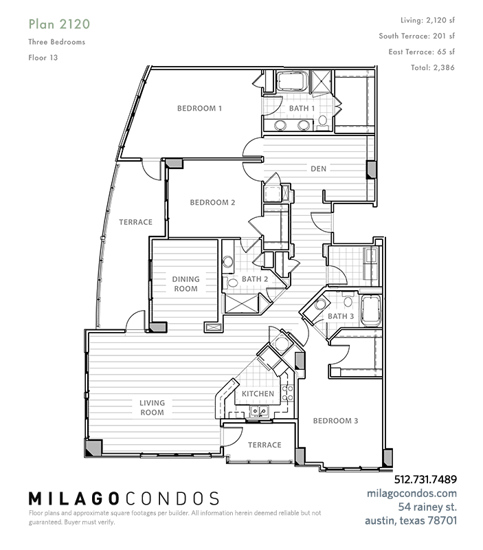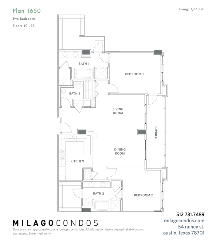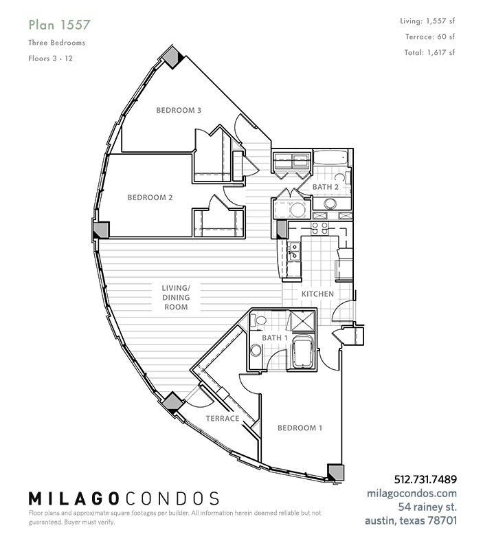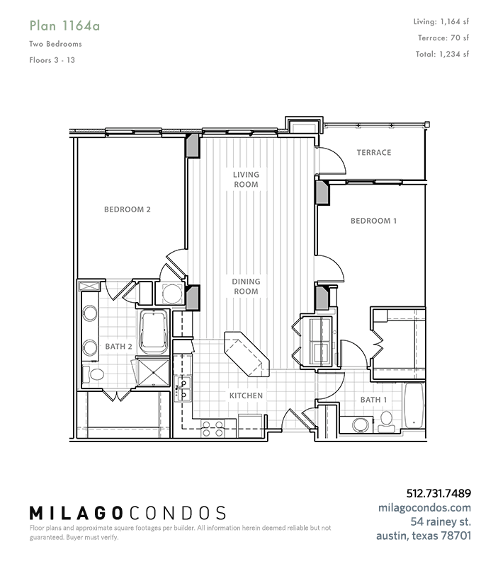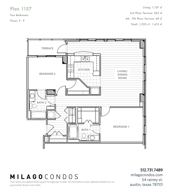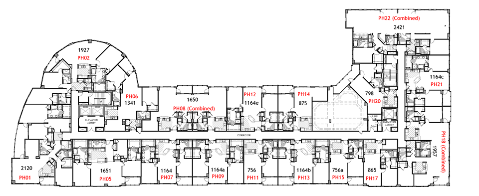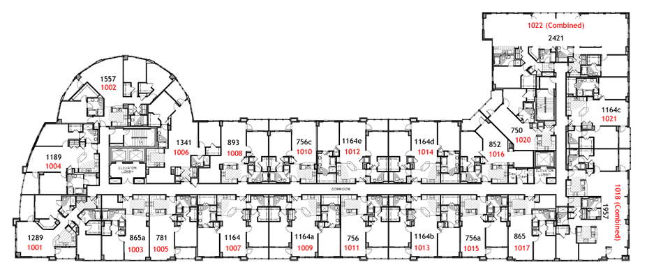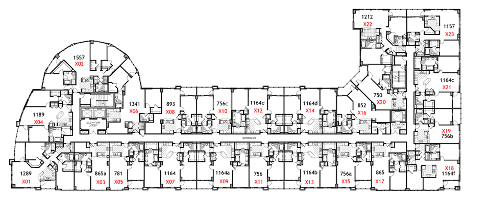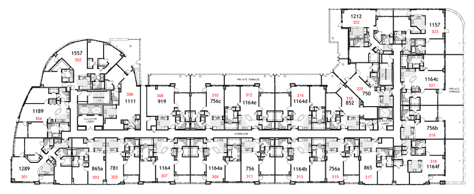 On the building map, the approximate square footage of a unit is shown in black and the unit number in red. Each floorplan is also referenced to the right by its approximate square footage.