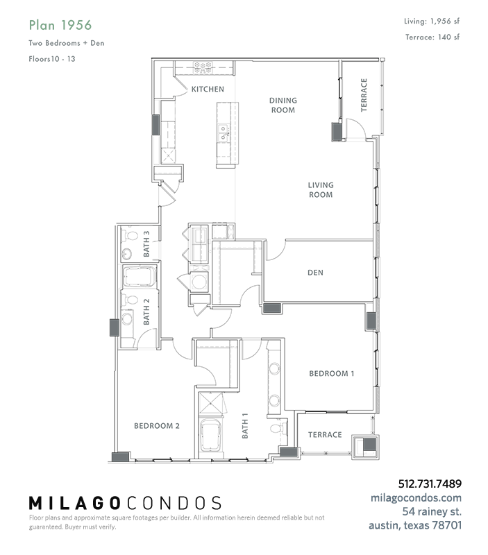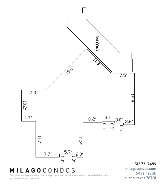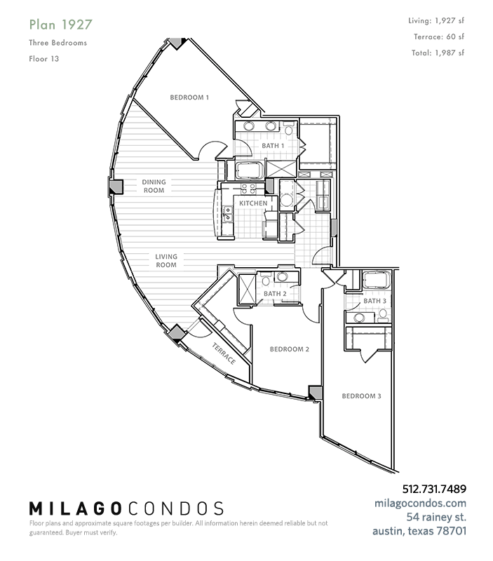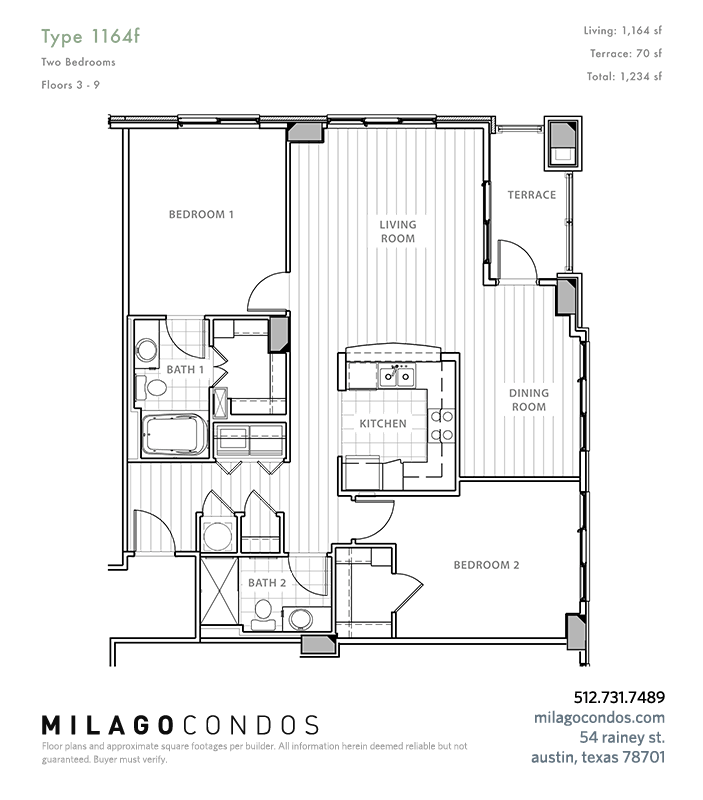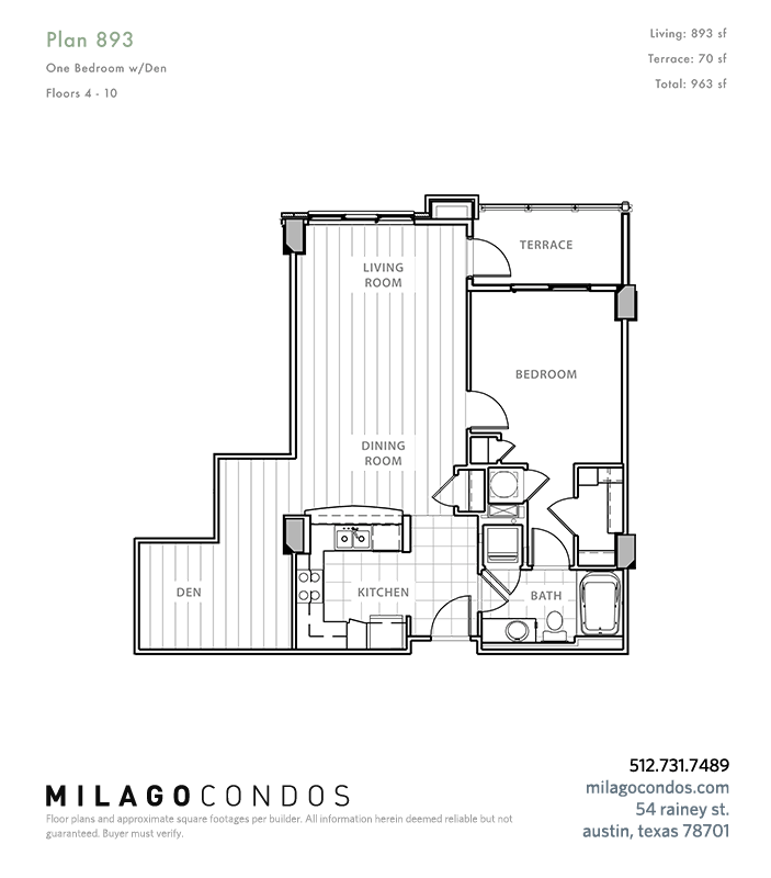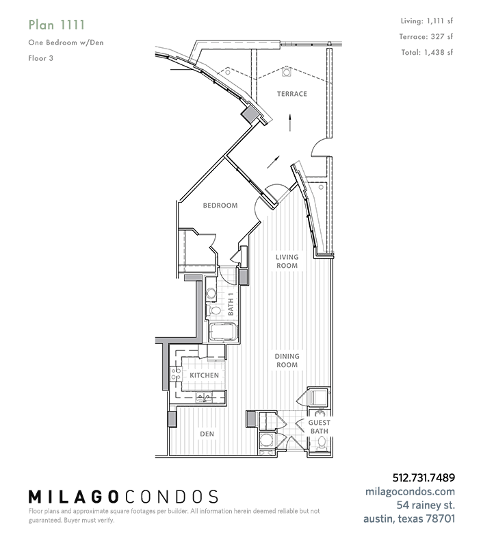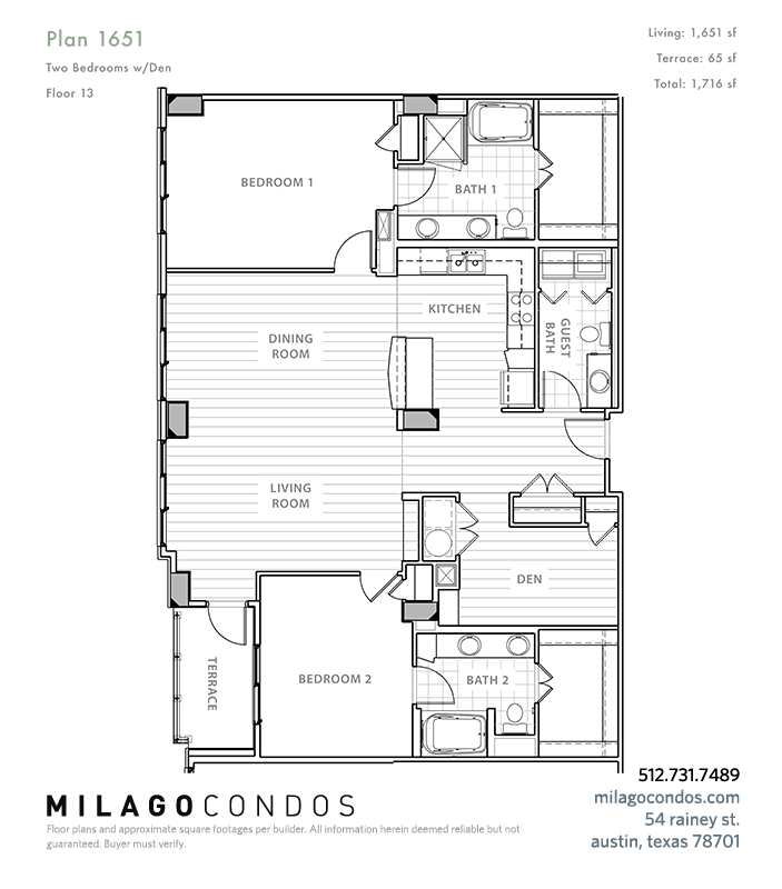 On the building map, the approximate square footage of a unit is shown in black and the unit number in red. Each floorplan is also referenced to the right by its approximate square footage.